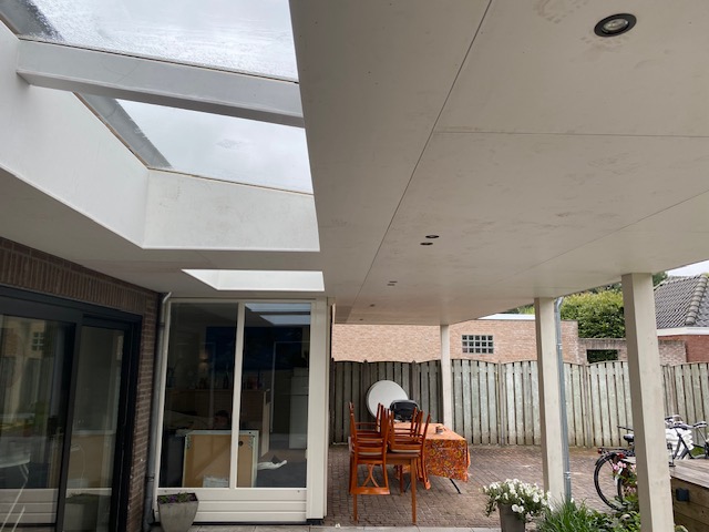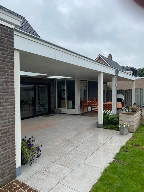 Bij deze klant hebben we een plan laten uitwerken voor een nieuwe overkapping. Hierbij hebben we een balklaag bevestigd aan het huis en zijn er kolommen met hardstenen sokkel ondergezet en aangestort in een poer. Hierna hebben we het dak voorzien van lichtstraten en is het dak vakkundig dicht gestookt. Als laatst hebben we het plafond en de lichtstraten uit getimmerd met witte garantieplaten zodat deze klant er weer jaren tegenaan kan.